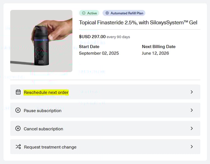 You will be brought to a new page with your following billing date information. Select your preferred refill billing date from this page and confirm it by clicking 'Reschedule order'.